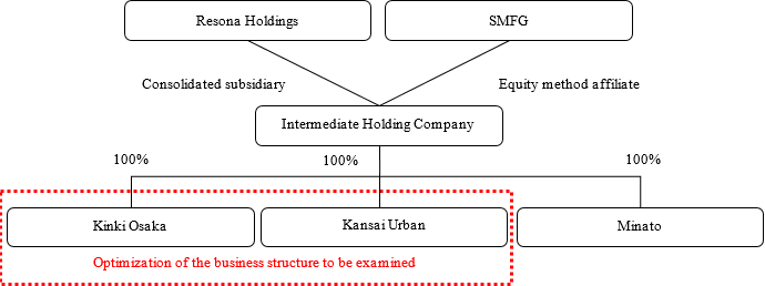 We are planning to integrate Minato, Kansai Urban and Kinki Osaka through a holding company structure whereby these banks will become wholly-owned subsidiaries of the intermediate holding company to be incorporated under the umbrella of Resona Holdings. The specific structure and method of the Business Integration, including stock transfers, stock exchanges and other methods, are subject to further discussion. The Integrating Parties, Resona Holdings and SMFG will determine how to deal with the preferred stock issued by Kansai Urban after considering various options but prior to the execution of the Definitive Agreement.
