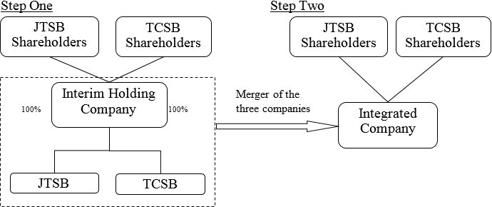 For step one of the Integration, an interim holding company will be established as a wholly-owning parent company of JTSB and TCSB, and both companies' corporate functions will be unified. Following the completion of preparations for integration of system operations, step two will commence, in which the three companies - the interim holding company, JTSB and TCSB - will merge and undergo final management integration.