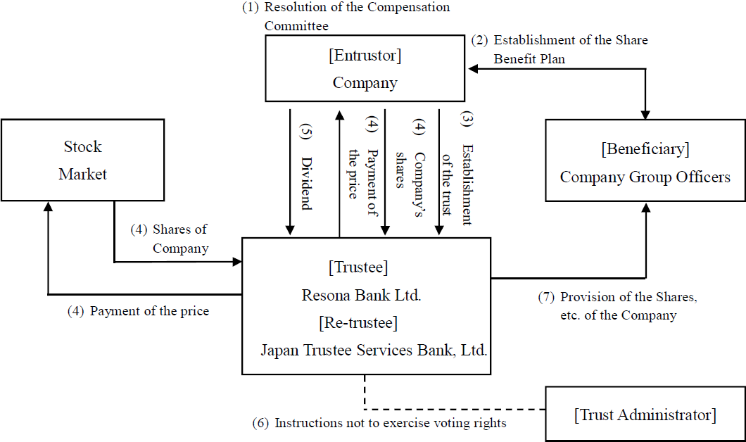 The Program is the stock compensation program that for the compensation of the Company Group Officers, the trust established by the Company's money contribution (the "Trust") acquires the Company's shares, and the Company's shares and money equivalent to the market value of the Company's shares corresponding to points awarded to each Company Group Officer (collectively, the "Shares, etc. of the Company") are provided through the Trust to each Company Group Officer based on the said performance indicators under the predetermined share benefit plan (the "Share Benefit Plan").