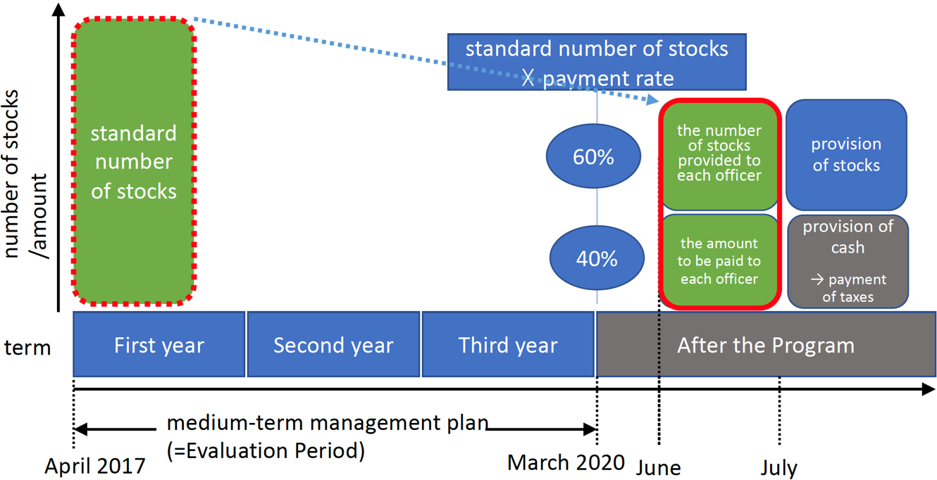 The Program is a medium-to long-term performance-linked remuneration based on the consolidated ROE (Stockholders' Equity Basis) for the final fiscal year of the Evaluation Target Period (the fiscal year ended March 31, 2020) as a performance indicator. The payment rate varies between 0% and 100% depending on the degree of achievement of the performance indicator with respect to the standard stock number determined in advance for each position. In addition, 60% of the total remuneration will be paid by the Company's common stock, and 40% will be paid in cash converted at the Company's stock price.