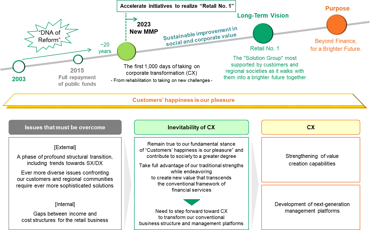 We will strive to ensure that lessons we have learned over the course of 20 years since the launch of Resona's reform are passed down to the next generation. At the same time, we will take a step forward toward taking on new challenges to realize "Retail No. 1." To cralify our way to proceed,we hereby establish our Purpose and Long-Term Vision as well as Long-Term Sustainability Indicators with FY2030 set as the target year. Moreover, we have set the direction of our long-term strategies as "Corporate Transformation(CX) to transform our conventional business structure and management platforms." In addition, our formulation of the new MMP was undertaken using a backcasting approach based upon this direction.