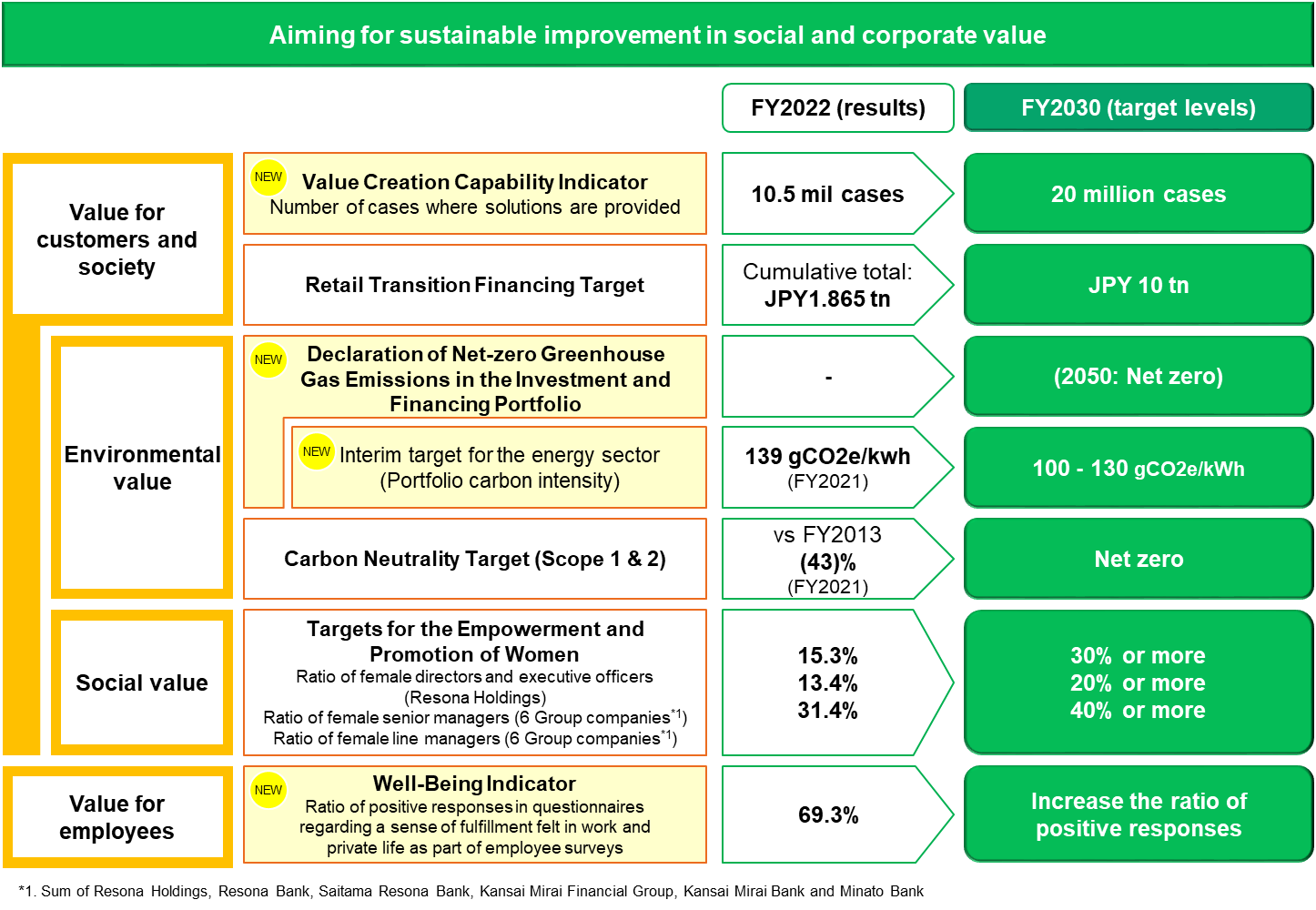 - To accelerate our initiatives to support sustainable improvement in social and corporate value, we have additionally set indicators to be achieved by the end of FY2030.