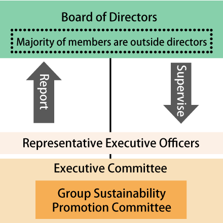 Based on the Policy, the status of relevant initiatives is being managed by the Group Sustainability Promotion Committee. Run by executives, this committee reports to the Board of Directors at least once a year. In addition, matters deemed particularly important are addressed by the Board on an as necessary basis. In this way, we have secured a robust structure that ensures proper supervision.