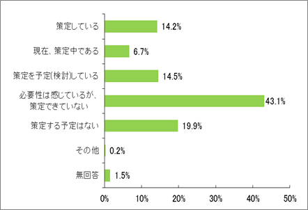 1. 1.回答企業2,534社のうち、「必要性は感じているが、策定できていない」との回答が43.1%と最も多く、「策定する予定はない」の19.9%がこれに次いだ。また、BCPを「策定している」、「現在、策定中である」と答えた企業の合計は20%程度にとどまっている。(図①-1参照)
