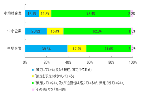 2. 2.1.のBCP策定状況を企業規模別にみると、「策定している」及び「現在、策定中である」と回答した企業の割合は、『中堅企業』の39.5%に対し、『中小企業』が20.3%、『小規模企業』が13.1%となり、規模の小さい企業の方がBCPの策定が進んでいないという調査結果となった。(図①-2参照)