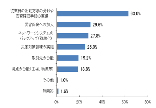 1.で「策定している」、「現在、策定中である」、「策定を予定(検討)している」のいずれかを選択した895社に対して、その内容を尋ねたところ、「従業員の出勤方法の分散や安否確認手段の整備」との回答が63.0%と最も多く、「災害保険への加入」の29.6%がこれに次いだ。(図③参照)