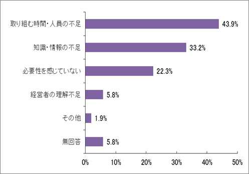 1.で「必要性は感じているが、策定できていない」、「策定する予定はない」のいずれかを選択した1,594社に対して、その理由を尋ねたところ、「取り組む時間・人員の不足」が43.9%で最も多く、「知識・情報の不足」が33.2%と続く。一方、「必要性を感じていない」も22.3%と3割近い。(図④参照)