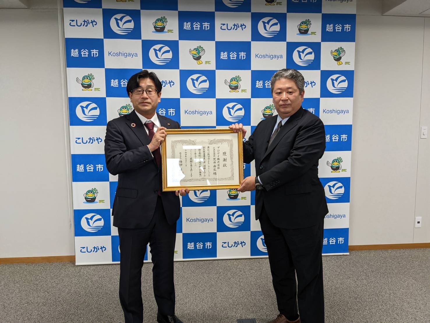 りそなグループの地域デザインラボさいたま(社長 青木 大介、以下「ラボたま」)が越谷市から受託した「企業版ふるさと納税PR等支援業務※1,2」を通じて、プロデイ株式会社(社長 荒井 由弘)による越谷市への寄附が実現し、10月12日(水)に感謝状贈呈式が行われました。なお、ラボたまの紹介による同市へ寄附は今回で6件目となります。