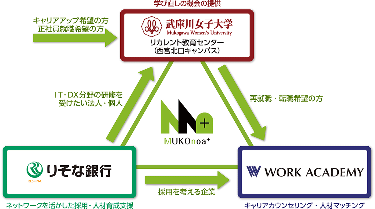りそなグループのりそな銀行(社長 岩永 省一)は、学校法人武庫川学院(以下、「武庫川女子大学」)並びに株式会社ワークアカデミー(以下、「ワークアカデミー」)とIT・DX分野を中心としたリカレント教育に伴うキャリア支援事業における連携協定を締結しました。