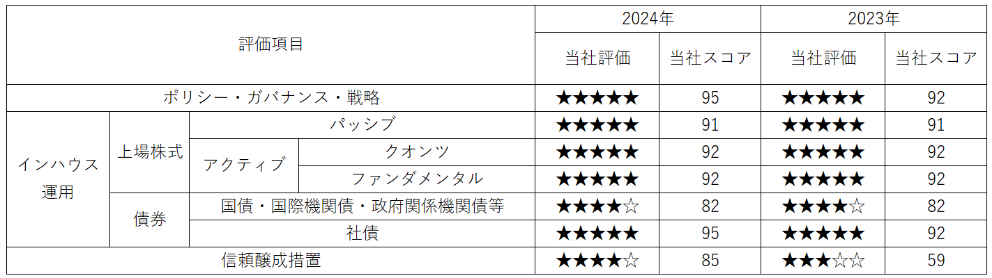 りそなアセットマネジメント(代表取締役社長 西山 明宏)は、責任投資原則(PRI:Principles for Responsible Investment)による2024年の年次評価において、2023年と同じく5項目で最高評価の「5つ星」を11月25日に獲得しました。さらに「信頼醸成措置」では、2023年の評価が59(3つ星)であったのに対し、2024年は85(4つ星)と評価が向上しました。