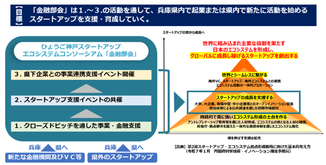 兵庫・神戸地域から新たなビジネスを創出するため、行政・企業・大学・金融機関・VCなどが連携して2019年12月25日に設立された組織。金融部会では、参加する金融機関やベンチャーキャピタルが、それぞれの専門性を活かしながら、地域のスタートアップに対して事業面・金融面の両側から協調支援を行い、イノベーションの促進とグローバル展開を後押ししている。