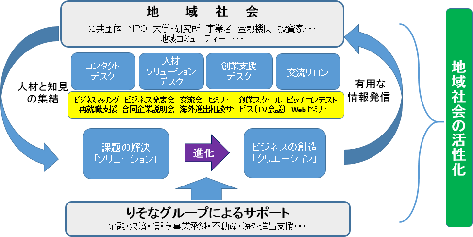 このプラザでは、以下の4つの機能を通じて、りそなグループが「産・官・学・民」のつなぎ役として 地域社会の活性化に取り組んでまいります。