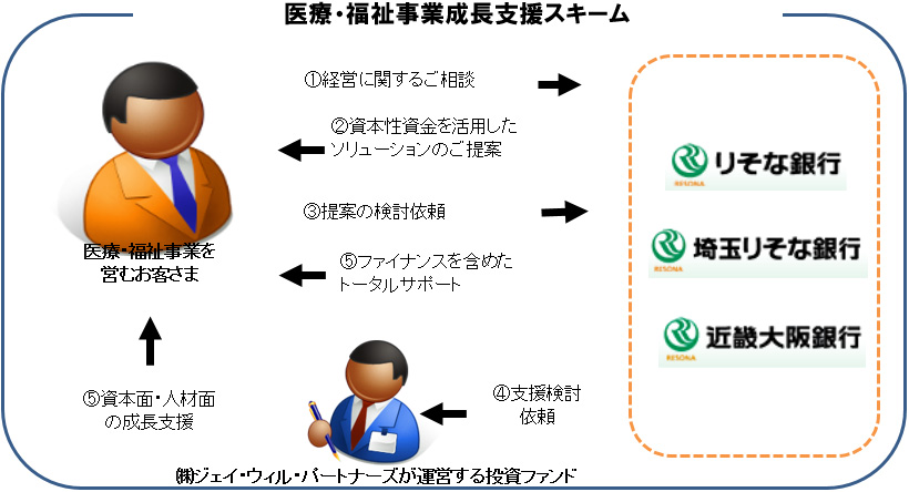りそなグループのりそな銀行(社長 東 和浩)、埼玉りそな銀行(社長 池田 一義)、近畿大阪銀行(社長 中前 公志)は、ヘルスケア分野への更なる取組強化策の一環として、投資ファンドの運営会社である株式会社ジェイ・ウィル・パートナーズ(社長 佐藤 雅典、以下「JWP社」という。)と同分野において連携し、本日、「医療・福祉事業成長支援スキーム」を創設するとともに、この運営を開始いたします。