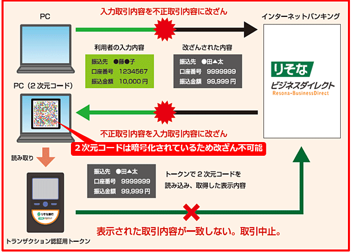 万が一、取引内容が途中で改ざんされた場合、トークンに表示される取引内容が異なりますので、不正送金を事前に防止することができます。