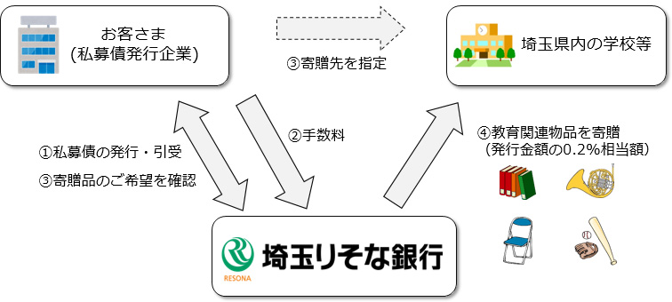 埼玉りそな銀行(社長 池田 一義)は、地域のお客さまとともに次世代を担う子供たちの成長を支援することを目的に、8月29日(月)より、「次世代育成型私募債~明日へのパスポート~」の取扱いを開始します。本商品は、当社が、私募債を発行されるお客さまから受け取る手数料の一部で図書やスポーツ用品、楽器等を購入し、埼玉県内の幼稚園や学校等に寄贈するものです。
