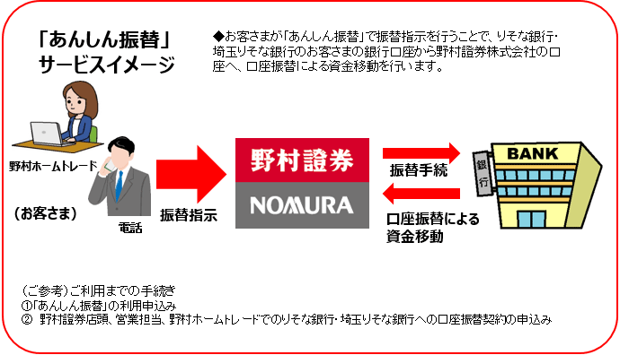 野村證券が提供する「あんしん振替」を利用すると、銀行口座からの振込手続なしで証券口座への入金が可能になります。