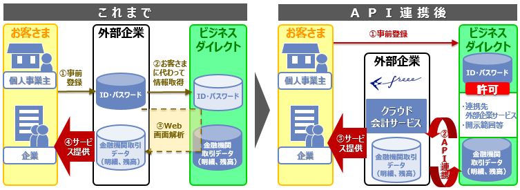 外部企業の銀行口座情報連動サービス等※2を利用するお客さまは、当該外部企業にビジネスダイレクトのログインID・パスワードを登録することなく、スムーズにサービスがご利用いただけるようになります。また、銀行が直接データを外部企業と連携することで、安全性も高まります。