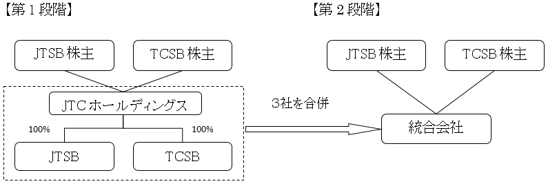 本件統合においては、第1段階として、JTSB及びTCSBによる本共同株式移転を行い、JTSB及びTCSBの既存株主を株主とする持株会社であるJTCホールディングスを設立するとともに、JTSB及びTCSBはその完全子会社となります。