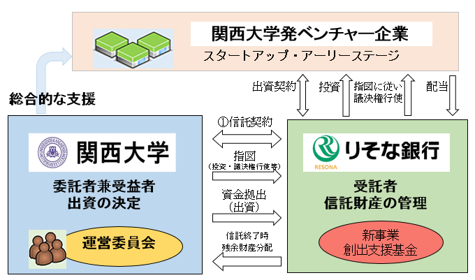 関西大学が新事業創出支援基金として拠出した資金を当社が管理し、関西大学の指示に基づいてベンチャー企業への投資を行います。さらに当社は受託者として投資実行時の事務手続きや投資後の株式管理事務などを担うことで、大学側の事務負担の低減とコスト削減を実現します。