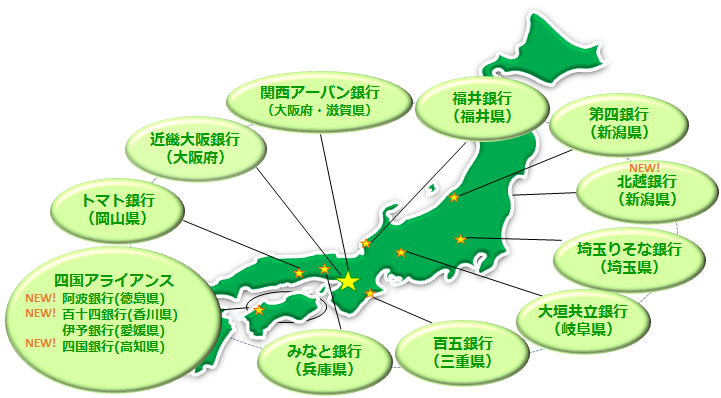 埼玉りそな銀行、大垣共立銀行、第四銀行、トマト銀行、百五銀行、福井銀行、北越銀行、四国アライアンス(伊予銀行、阿波銀行、四国銀行、百十四銀行) |