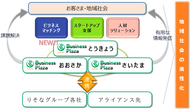 りそなグループは関西アーバン銀行とみなと銀行が加わったことで法人のお取引先数が約50万社に拡大いたしました。このネットワークを「ビジネスプラザおおさか」「ビジネスプラザさいたま」と連携することで活用し、お客さまの「販路拡大」「技術開発力向上」をサポートいたします。