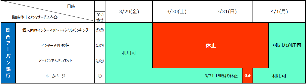 関西みらいフィナンシャルグループの関西アーバン銀行(頭取 橋本 和正)及び近畿大阪銀行(社長 中前 公志)は、両行の合併に伴い、2019年3月29日(金)から4月1日(月)までの間、一部のオンラインサービスを臨時休止いたします。