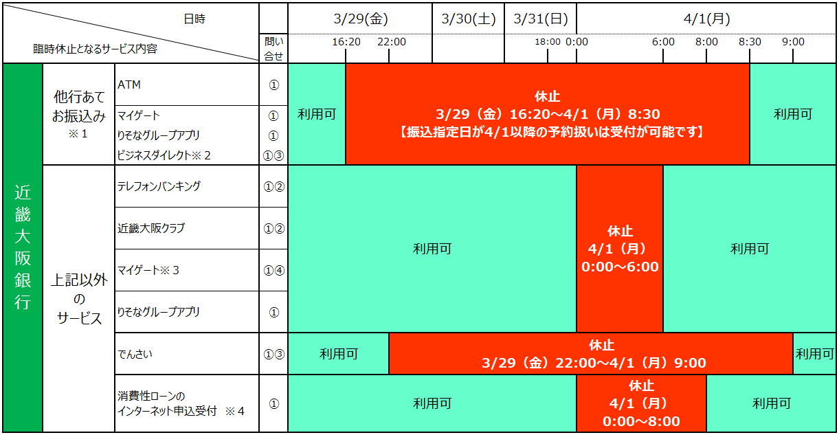 - ※1休止期間中は他行からのお振込みも即時入金できません。なお、りそな銀行・埼玉りそな銀行・近畿大阪銀行間の振込・振替は即時入金となります。