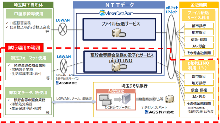株式会社埼玉りそな銀行(以下、埼玉りそな銀行)、AGS株式会社(以下、AGS)および株式会社NTTデータ(以下:NTTデータ)は、埼玉県下の自治体等と金融機関間における取引のデジタル化推進に向け協業することで合意しました。