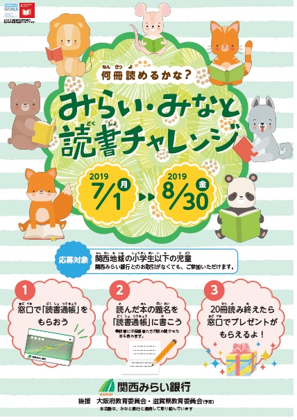 子どもたちが身近に「読書」に親しむ機会を設け、言葉を学び、創造力を高める機会を提供するため、2019年7月1日から同年8月末日までの期間、大阪府、兵庫県、滋賀県を中心とした関西広域の営業エリアにおいて、地域の小学生を対象に「読書チャレンジ」を実施いたします。