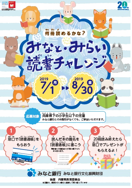 ご家族やお友だちと一緒に、楽しく最後まで続けて頂けるよう、読書を記録する「読書通帳」は本物の通帳をイメージしたデザインとし、20冊以上読んだ子どもたちには賞品をプレゼントします。