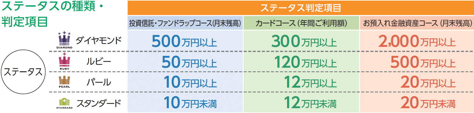 - ※3パール以上でATMご利用手数料0円、ルビー以上でコンビニ手数料キャッシュバックなど、上位ステータスになるほど優遇特典が充実します。また、給与・年金のお受取りや住宅関連ローンをご契約のお客さまへの特典もございます。