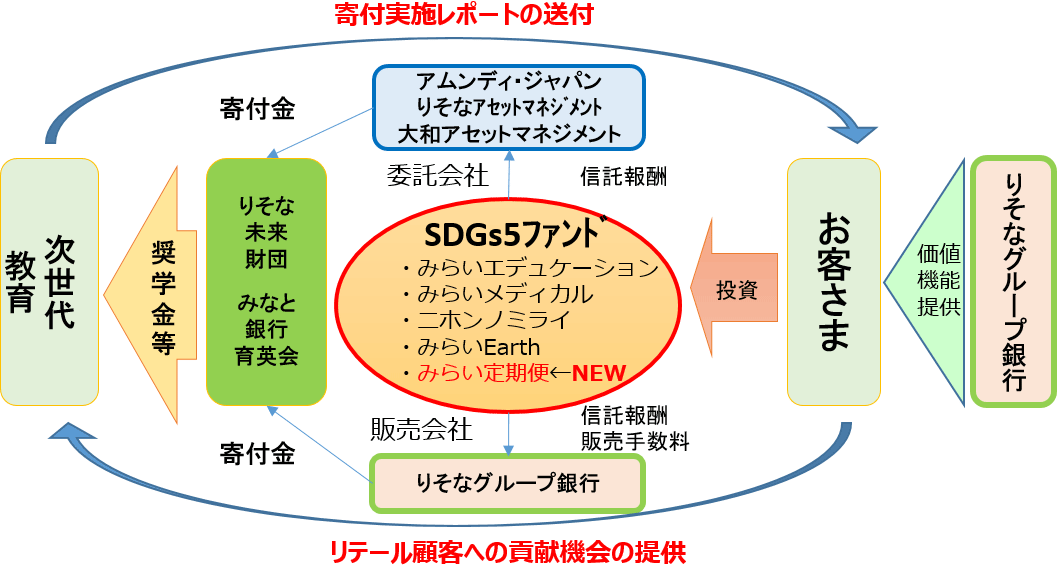 SDGsに関連する投資信託5商品の取扱いで得る収益の一部をりそなグループの販売会社、委託会社が共同で寄付を実施します。 |