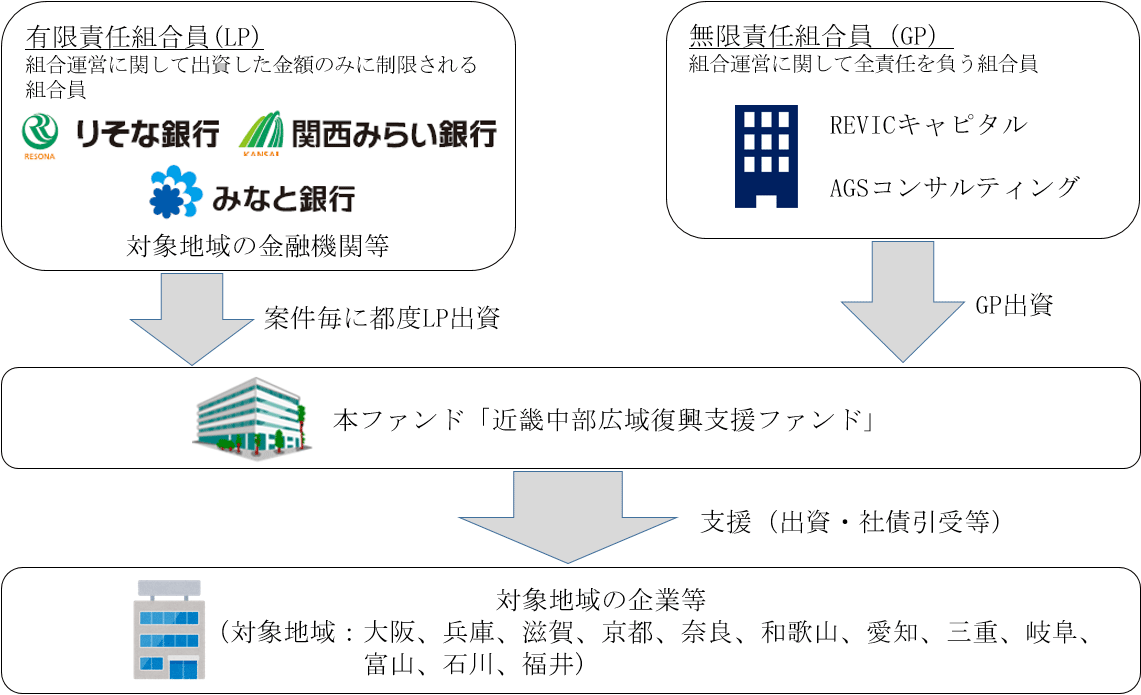 りそなグループのりそな銀行(社長 岩永 省一)、関西みらいフィナンシャルグループ傘下の関西みらい銀行(社長 菅 哲哉)、みなと銀行(頭取 服部 博明)は、新型コロナウイルス感染症の影響を受けた事業者の復興・再生支援を目的に、株式会社地域経済活性化支援機構(以下「REVIC」)が新設する「近畿中部広域復興支援ファンド」に出資いたします。