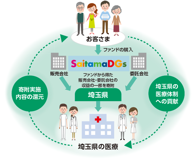 本商品の収益の一部を、埼玉県の「新型コロナウイルス感染症対策推進基金」に寄附し、医療従事者や医療機関の活動を支援する埼玉県の取り組みをサポートすることで、新型コロナウイルスに負けない社会づくりに貢献したいというお客さまのニーズにお応えします。