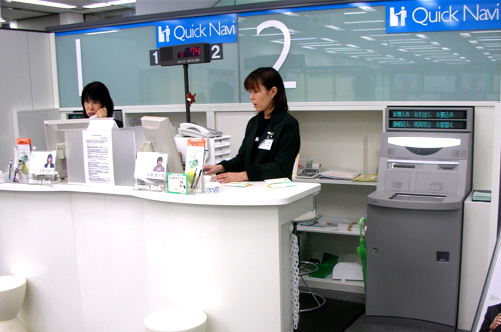 お客さまの利便性向上とローコスト運営の両立を実現するためにセミセルフ端末「クイックナビ」を導入しています。社員端末とATM等を連携させることで、キャッシュカードがあれば伝票レス・印鑑レスでお取引いただける店頭体制を構築しています。こうした店頭業務改革により、窓口の「17時まで営業」を実現しています。