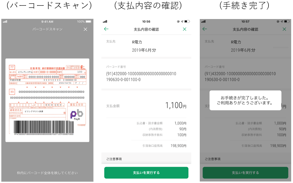 税金や公共料金の支払いで使われる払込票※2に記載のペイビーマーク付きバーコードをアプリのスキャン機能で読み取ることで、金融機関やコンビニに行くことなく、簡単・便利に即時で支払いが完結できるようになります。