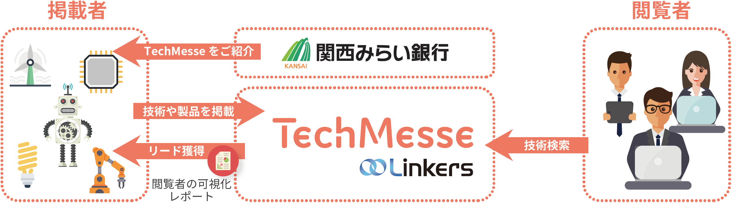 そこで、関西みらい銀行は、この業務提携により関西の地域金融機関としては初めて、リンカーズが運用するものづくり企業向けWeb展示会「TechMesse(以下、テックメッセ)」を活用し、お客さまの販路拡大をはじめとした事業拡大への支援を開始いたします。