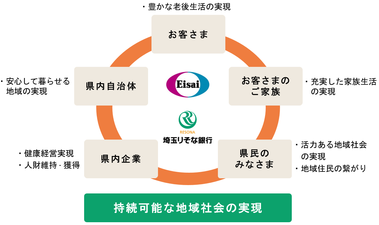 さらに、埼玉りそな銀行とエーザイは、認知症エコシステムを通じて県内自治体や企業、大学、公共機関等と連携し、県民の皆さまの不安の軽減・解消や豊かな老後生活の実現、県内企業の健康経営の実現など、持続可能な安心して暮らせる地域社会づくりに向けた価値共創をめざしてまいります。