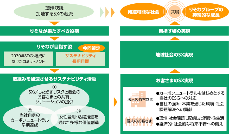 りそなホールディングスと関西みらいフィナンシャルグループがそれぞれ公表した「2030年SDGs達成に向けたコミットメント」に続き、当グループでは今般3つの「サステナビリティ長期目標」を策定しました。当グループが経営ビジョンとして掲げる「持続可能な社会とりそなグループの持続的な成長の共鳴」に向け、「お客さまもりそなグループも変化への適応力を備えたビジネスモデル・ライフスタイルへ進化を遂げること」、「お客さまのSXに最も貢献する企業になること」を目指し、お客さまとの対話を深めながら、1つ1つ課題を克服し、グループ一丸となって「目指す姿」の実現に取り組んでまいります。