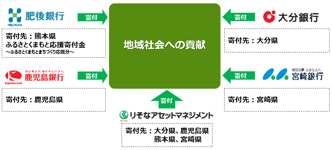 本商品の収益の一部を、各銀行ならびに当社が各県の地域応援関連の基金や新型コロナ対策基金等に寄付します。本商品の提供を通じて「中・南九州の地域循環共生圏に関する連携協定※2」に基づく地域創生等の取り組みに貢献します。