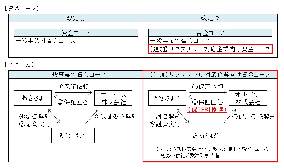 本コースは、迅速に事業性資金の円滑化を図る特長を持つ『スーパー・スクラム』と社会的関心が高まる『脱炭素※1』のコラボであり、オリックス株式会社から低CO2排出係数メニューの電気の供給を受ける脱炭素経営に取り組む事業者に対して、保証料率を優遇する特典付きコースです。なお、オリックス株式会社で同種のコースを取り扱うのは、みなと銀行が全国で初めてとなります。