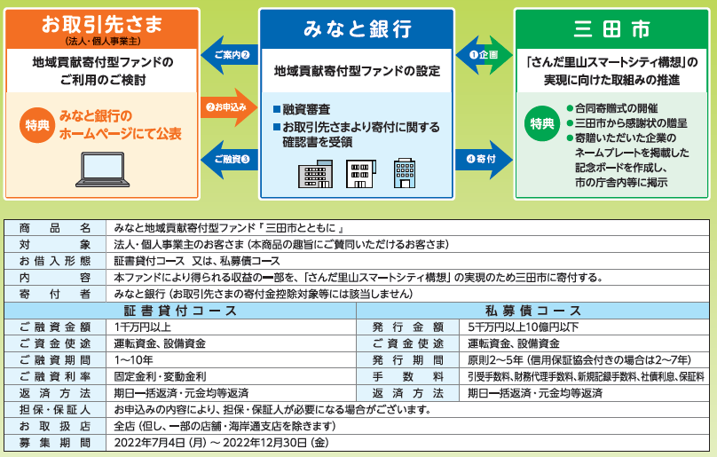 関西みらいフィナンシャルグループのみなと銀行(社長 武市 寿一)では、三田市と締結した連携協定に基づく事業の一環として、2022年7月4日より掲題新商品の取扱いを開始しましたのでお知らせします。