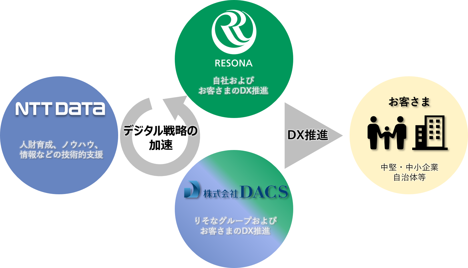 りそなグループは、ITに関する高い技術力を有するNTTデータグループの一員であり、中堅・中小企業に対するDX推進支援の実績を持つDACSとの関係を強化することで、りそなグループおよび中堅・中小企業のお客さまのDXを推進して参ります。
