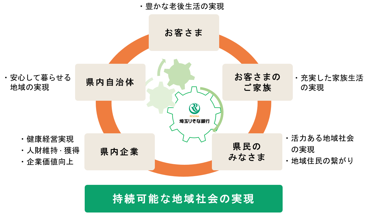 埼玉りそな銀行においては、本格的な少子高齢社会を迎える中で、地域の皆さまの「老後の安心」「暮らしの安心」「相続の安心」「社会の安心」の実現に向けて、産学官金連携のハブ機能を発揮し、誰もが暮らしやすい社会づくりに貢献します。