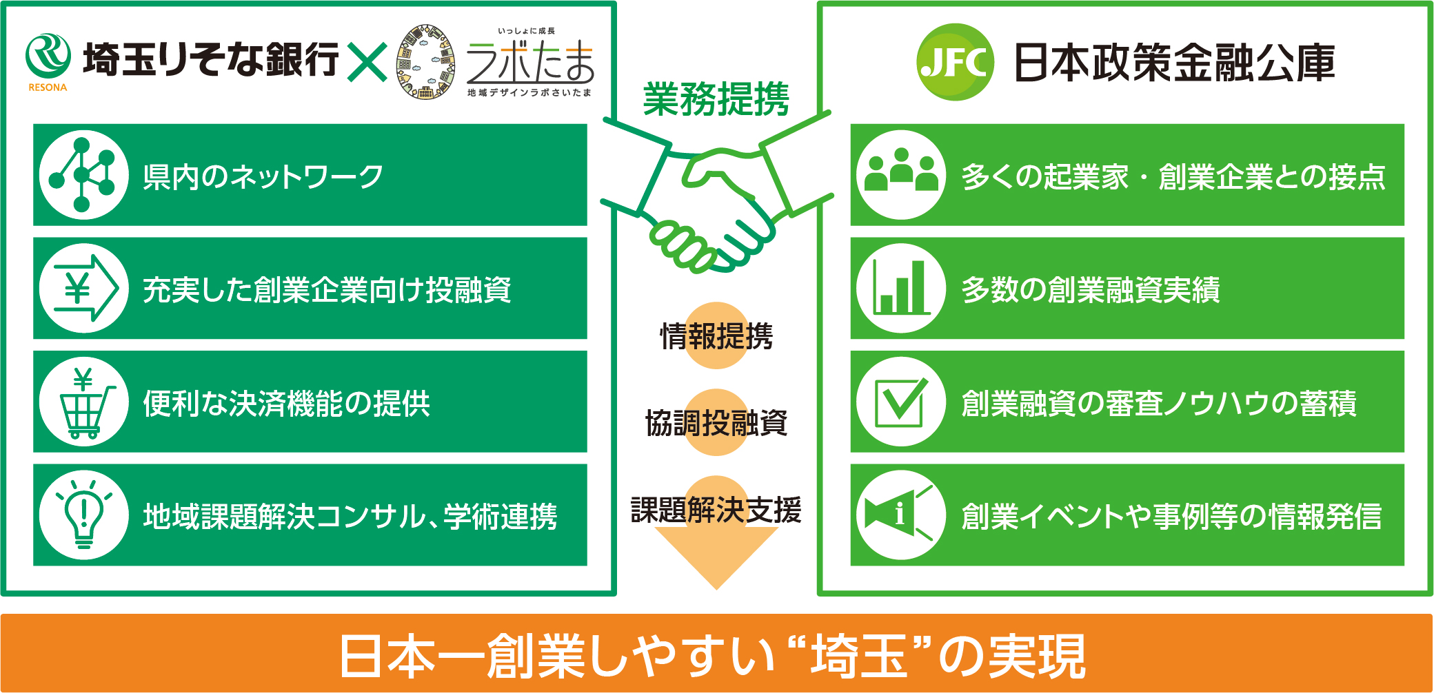 本覚書締結により、埼玉りそな銀行が有する県内のネットワークと、日本政策金融公庫の創業支援における経験知と情報網の融合を通じて、融資や投資ファンドを通じた資本性資金等を提供するほか、事業計画策定や販路拡大などの課題解決支援における連携を強化し、創業・第二創業企業の成長を後押しします。