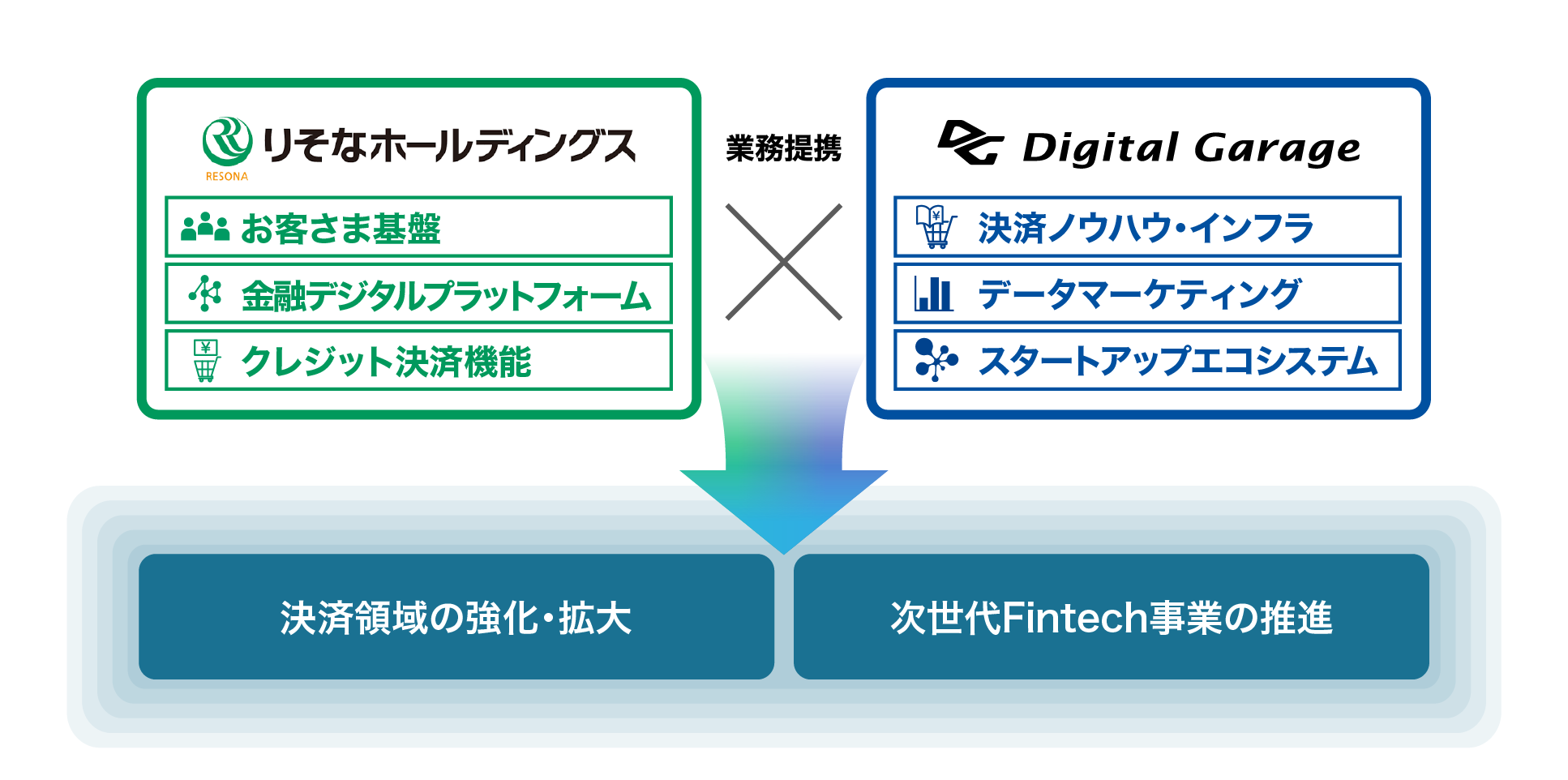 りそなグループとデジタルガレージは、長年にわたり、法人のお客さま向けの決済ソリューションを提供してきました。両社は、今回の資本業務提携を通じて、りそなグループが持つお客さま基盤や与信等のノウハウとデジタルガレージが持つ国内最大級の決済プラットフォームやFintechをはじめとするスタートアップ・エコシステムを融合し、決済事業の強化・シェア拡大を図るとともに、次世代Fintechビジネスの開発を推進することで、便利で安全・安心なキャッシュレス社会の実現に貢献してまいります。
