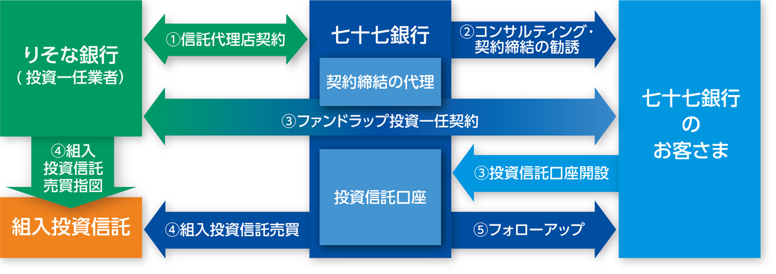 七十七銀行とりそな銀行は、人生100年時代における地域のお客さまの中長期的な資産形成をサポートするため、長期分散投資および資産管理サービス機能を持つファンドラップを活用していくことで合意しました。七十七銀行のお客さまは、七十七銀行の投資信託口座を通じてファンドラップサービスをご利用いただけます。