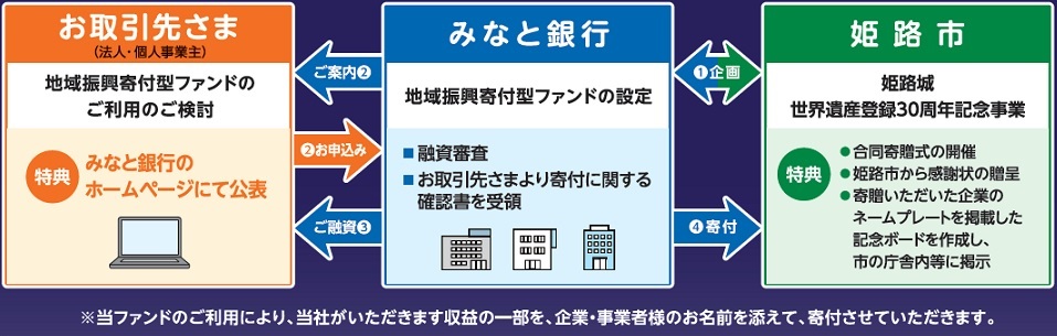 本ファンドは、その施策の趣旨にご賛同いただける法人・個人事業主を対象とした融資商品で、本ファンドによる収益の一部を姫路市に寄付いたします(目標額:30億円、目標達成時寄付額300万円)。本寄付金は、姫路城世界遺産登録30周年の記念事業にお役立ていただく予定です。