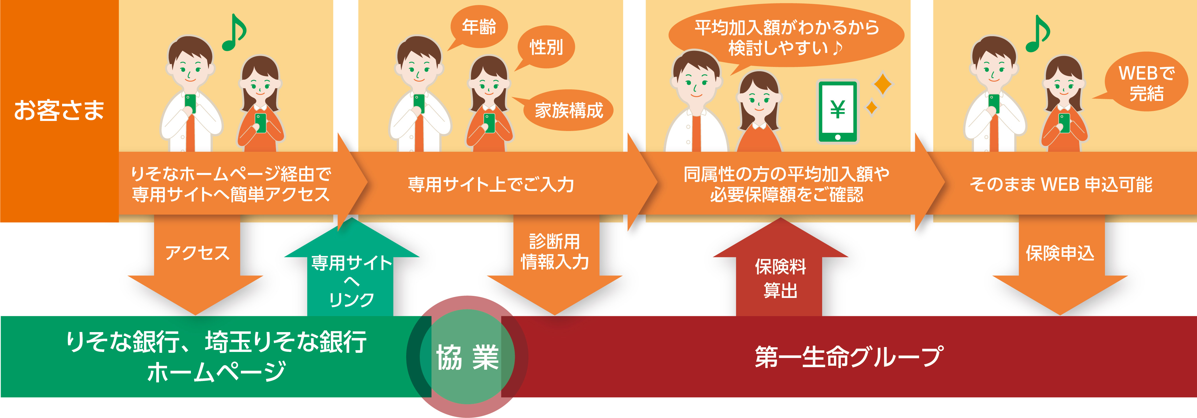 りそなグループのりそな銀行(社長 岩永 省一)、埼玉りそな銀行(社長 福岡 聡)は、本日より、第一生命グループとのデジタル完結スキーム(デジタル保険)協業プロジェクト※の第二弾として、第一生命(社長 稲垣 精二)のデジタル完結型商品ブランド「デジホ」の新商品「定期保険」の取り扱いを開始します。また、お客さまの必要保障額を算出できる「かんたん保険診断」を新たに導入します。