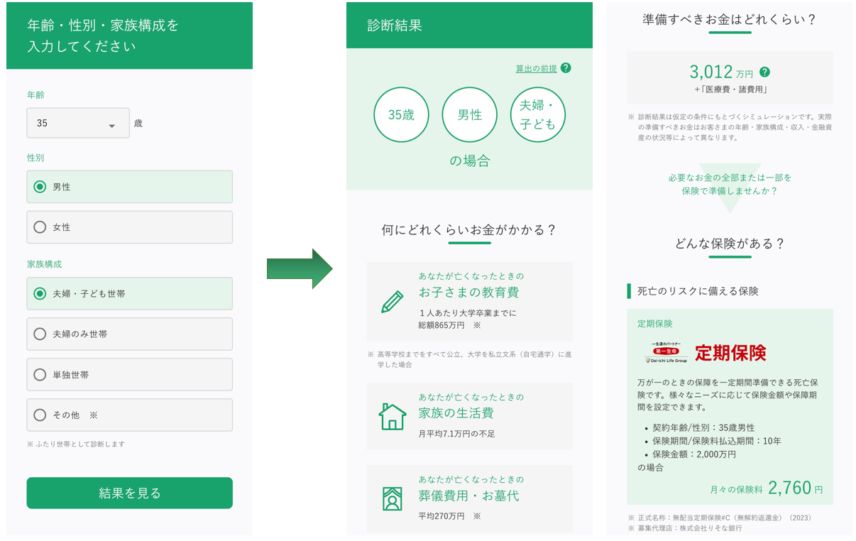 「かんたん保険診断」は、年齢・性別・家族構成を入力するだけで、お客さまと同じ属性の方の生命保険の平均加入額や、必要保障額を簡単に試算できるツールです。インターネットを通じて、いつでもどこでも保険金額等の検討がしやすくなり、家事やお仕事で多忙なお客さまでも、納得感や満足感を持った契約の申し込みが可能になります。
